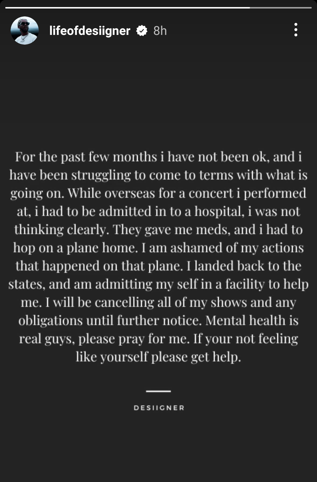Rapper, Desiigner has revealed he will be putting his career on hold while getting help for his mental health after allegedly exposing himself on a recent international flight.
