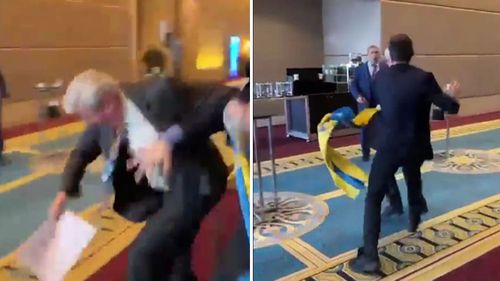 A fight broke out at a summit in Turkey after a Russian delegate pulled down a Ukrainian flag from a Ukrainian representative amid escalating tensions between Russia and Ukraine.